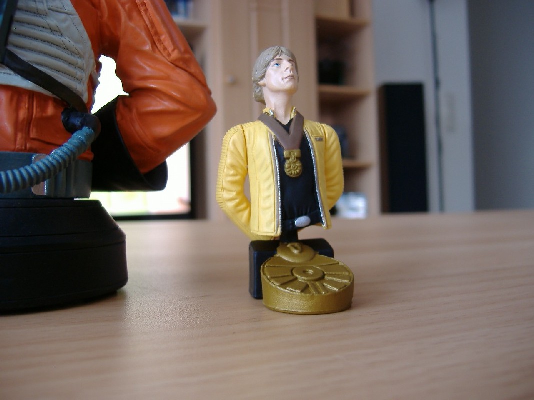 Eine sehr schöne Büste von Luke Skywalker in seiner X-Wing-Pilotenuniform. Als Extra-Beilage gabs auch noch eine sehr kleine Büste, die Luke bei der Ordensvergabe auf Yavin zeigt. Verkauft aufgrund der Sammlungsumstrukturierung