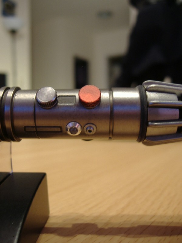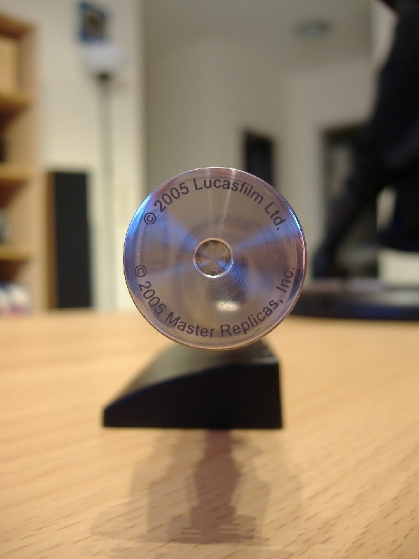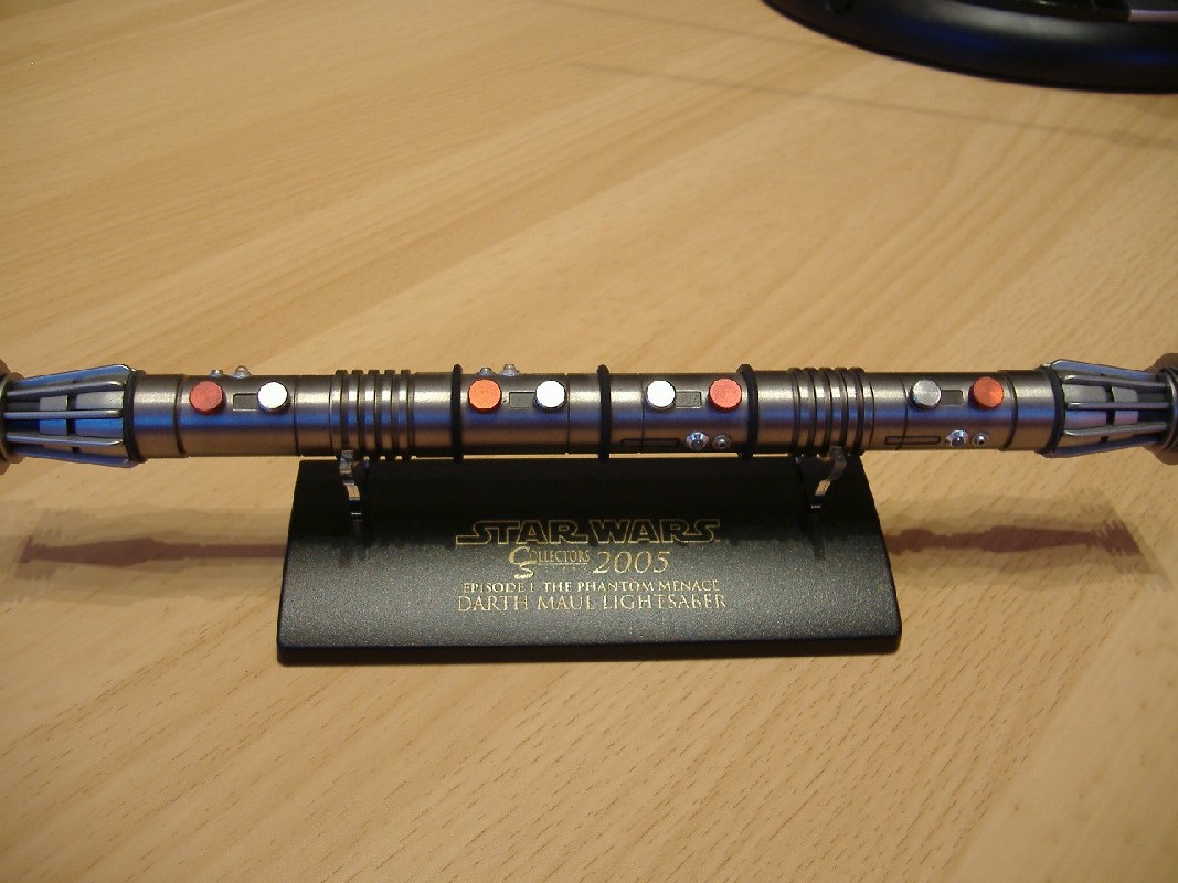 Diese sehr seltene Miniatur zeigt den Griff des Doppel-Lichtschwertes von Darth Maul. Wurde verkauft, da sich die Darth Maul PF ein Fach mit der Darth Talon teilen sollte und daher kein Platz mehr für das Lichtschwert da war