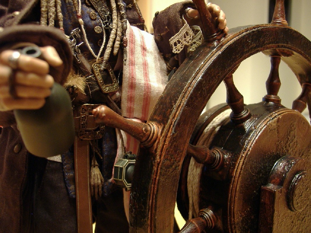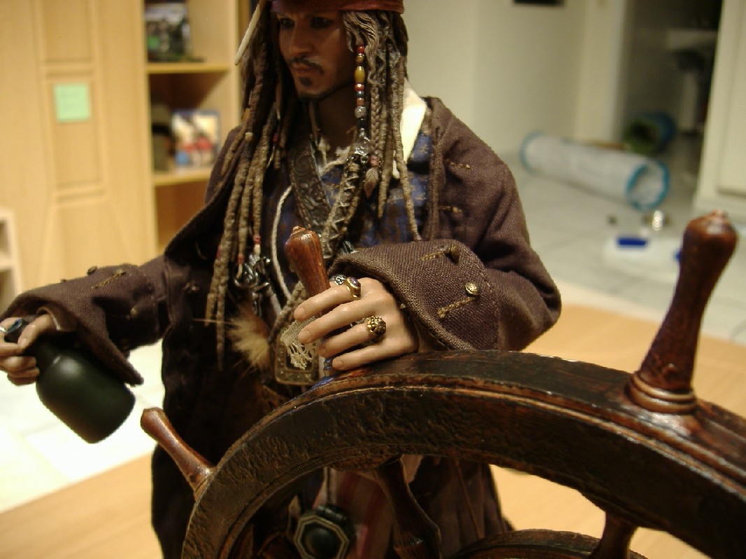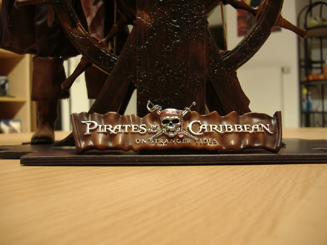 Die Base Bewertung: 9 von 10 Punkten Hier hat Hot Toys ganze Arbeit geleistet. Entgegen einer möglicherweise langweiligen Grundplatte mit der Halterung für die Figur gibt es ein Steuerrad mit dazu passenden Planken. Hier kann man die Figur problemlos sicher platzieren und dazu sieht die Bemalung noch täuschend echt aus. Die Befestigung des Steuerseils mittels Knoten ist ein wenig lästig, ich habe es nie perfekt stramm hinbekommen. Daher nicht die volle Punktzahl