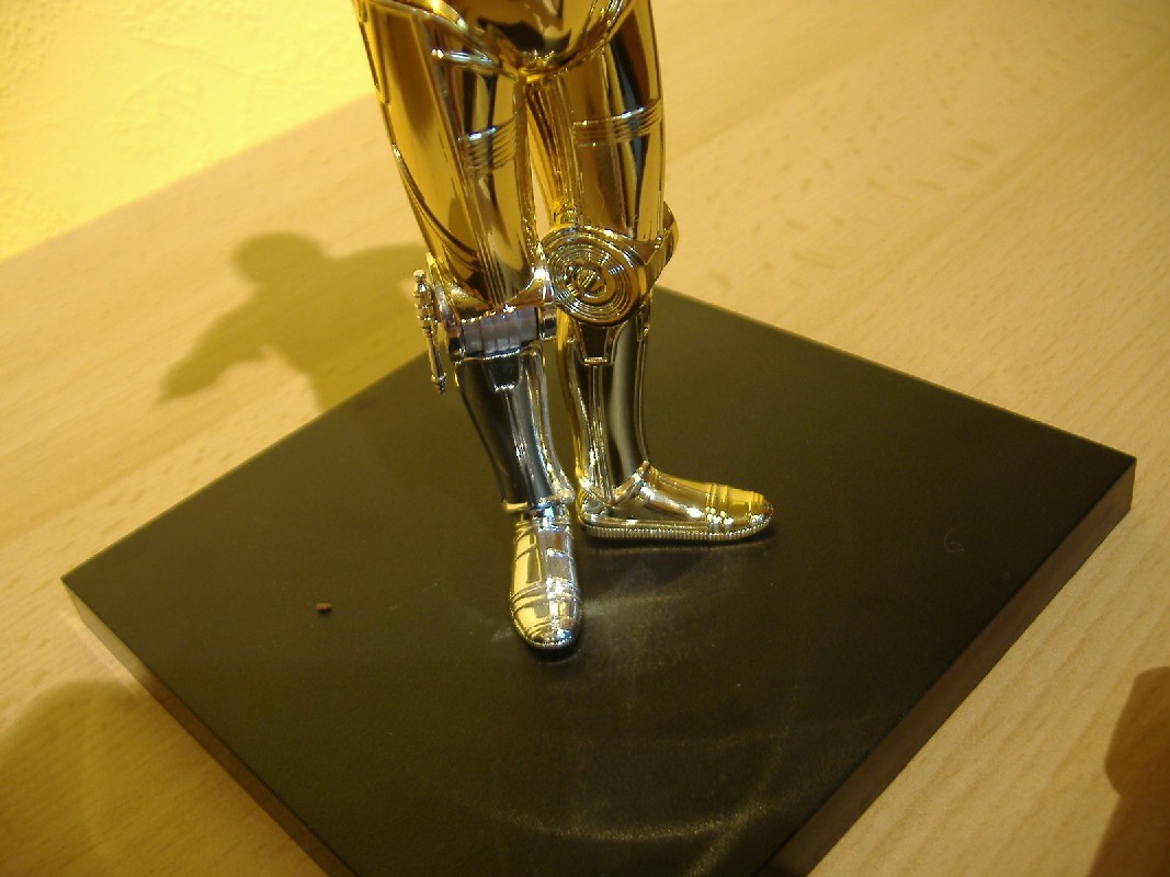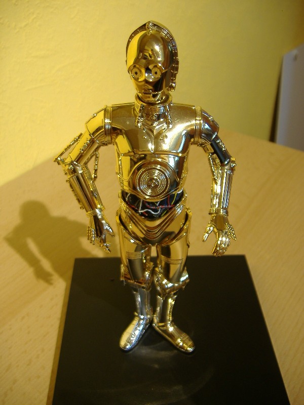 C-3PO Bewertung: 8 von 10 Punkten Der Droide ist so hochglänzend, dass er grade aus der Waschstraße zu kommen scheint. Für den Maßstab passen die Details schon sehr gut, dazu kann man die Arme beliebig präsentieren und auch der Kopf ist drehbar